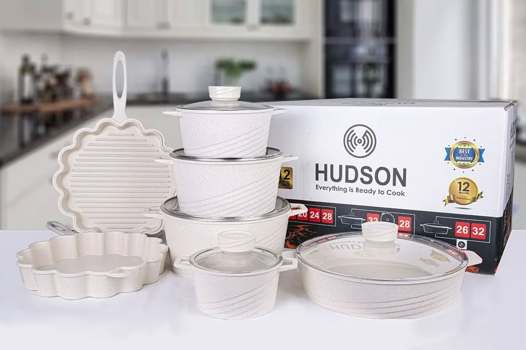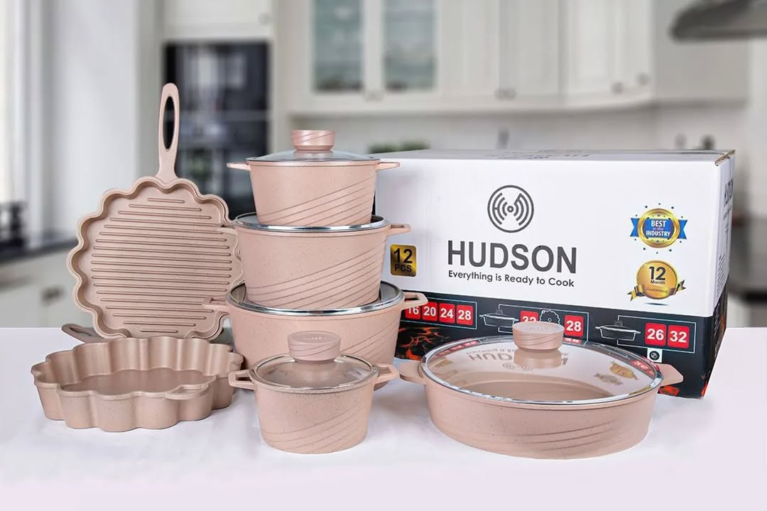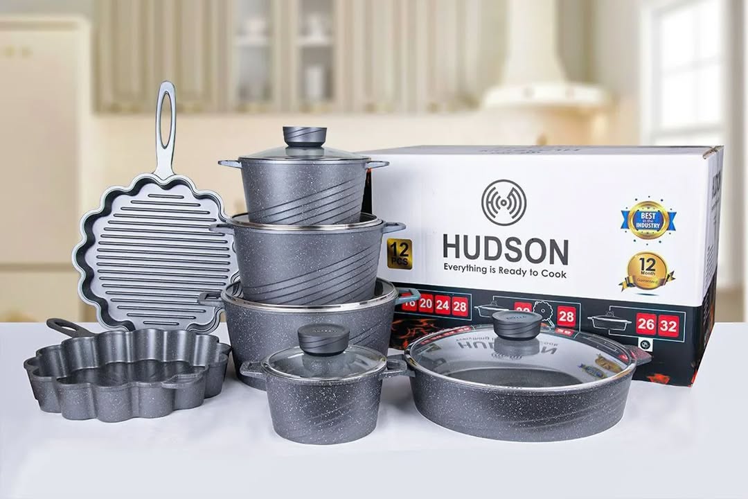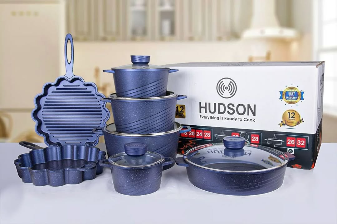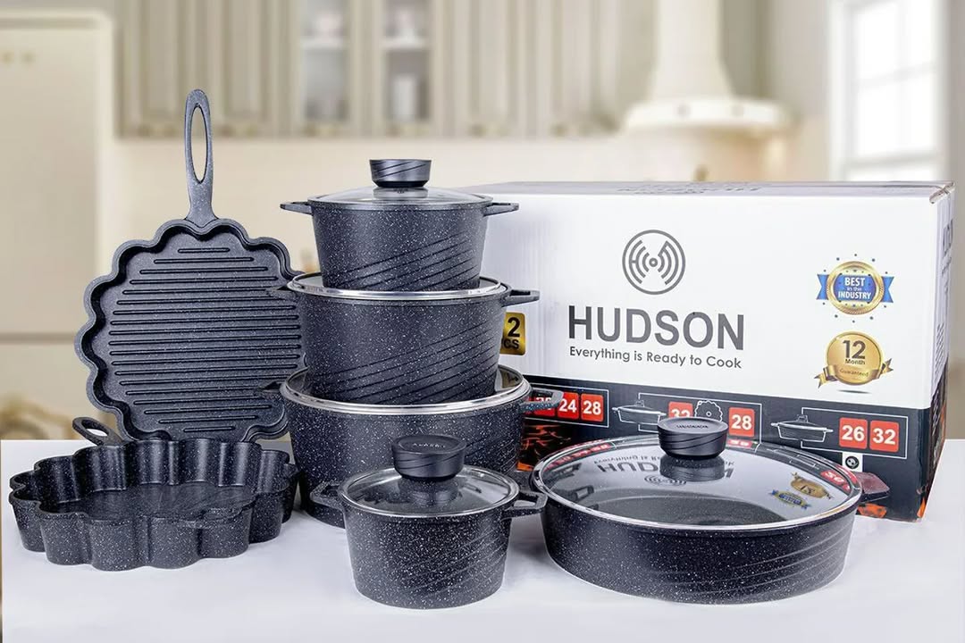 اقلام شامل : 4 عدد قابلمه در سایزهای 16/20/24/28 در کنار یک عدد تابه دو دسته سایز 32 و یک عدد تابه دو تایی