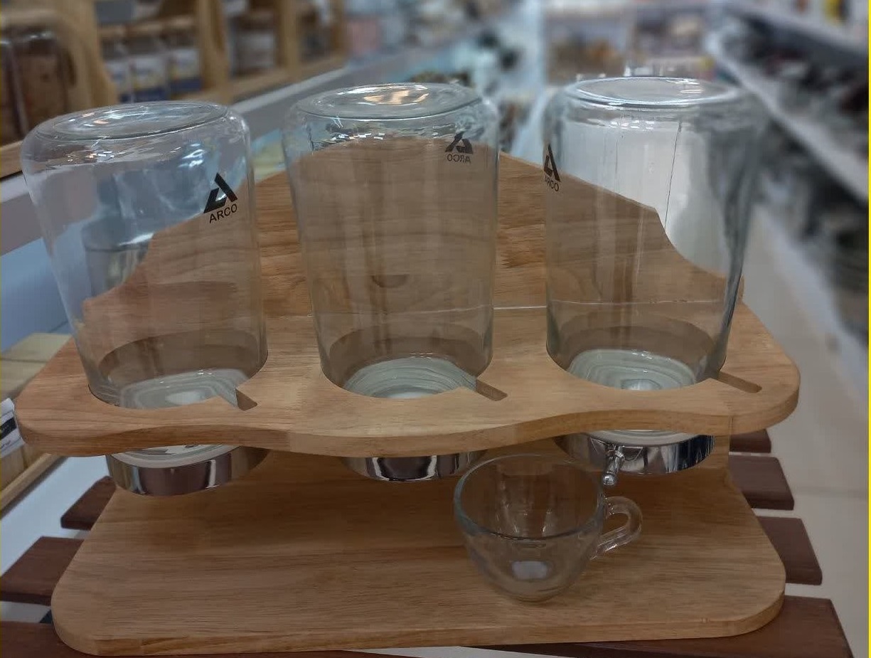 هر محصول شامل یک عدد استند چوبی بزرگ، سه عدد بانکه بزرگ شیشه ای به همراه درب چرخان و یک عدد پیمانه شیشه ای دسته دار است.