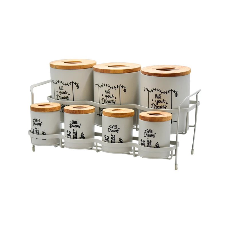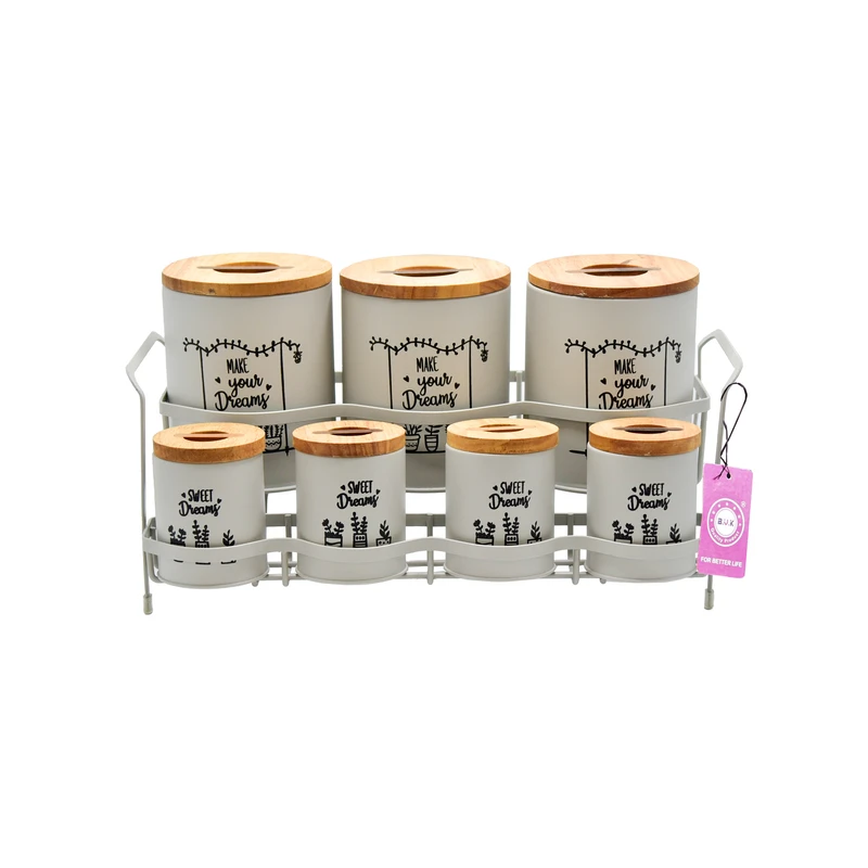 ست جا ادویه و پاسماوری دارای طرح های کلاسیک و مدرن است.این محصول خاص میتوان برای انواع ادویه جات ،شکر،قند و….استفاده نمود.تنوع رنگی این محصول زیبا می باشند و این ست 8 پارچه دارای3 عدد بانکه ، 4 عدد جای ادویه، 1عدد استند می باشد.