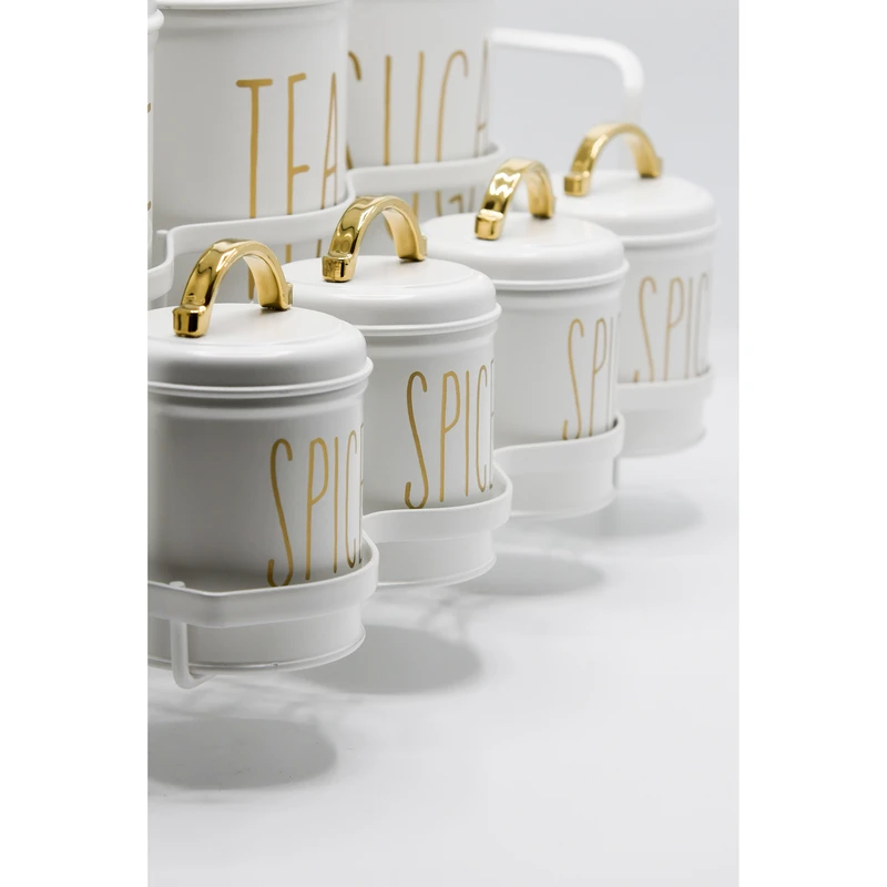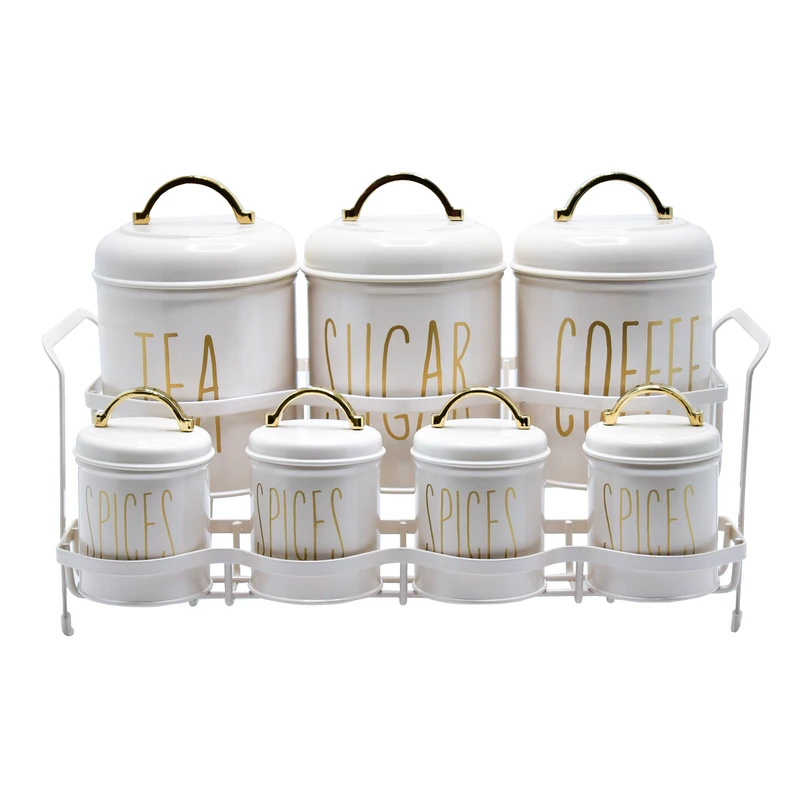 ست جا ادویه و پاسماوری دارای طرح های کلاسیک و مدرن است.این محصول خاص میتوان برای انواع ادویه جات ،شکر،قند و….استفاده نمود.تنوع رنگی این محصول زیبا می باشند و این ست 8 پارچه دارای3 عدد بانکه ، 4 عدد جای ادویه، 1عدد استند می باشد.