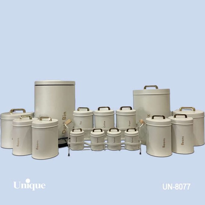 ۱ عدد سطل زباله – ۱ عدد ظرف شکر – ۱ عدد ظرف برنج – ۴ عدد بانکه – ۴ عدد جا ادویه ای به همراه ۱ عدد استند