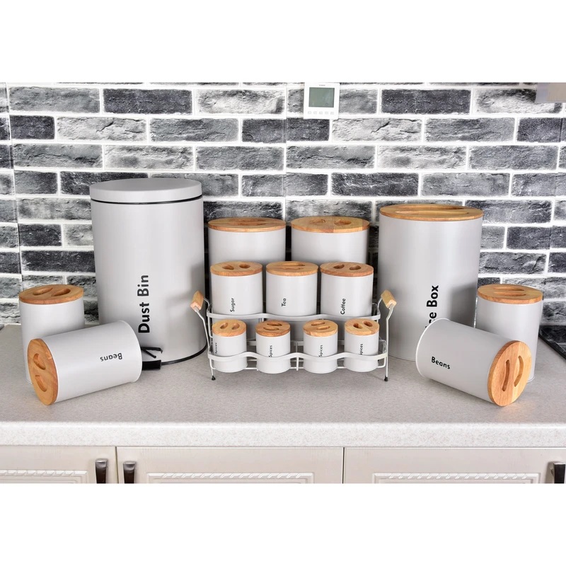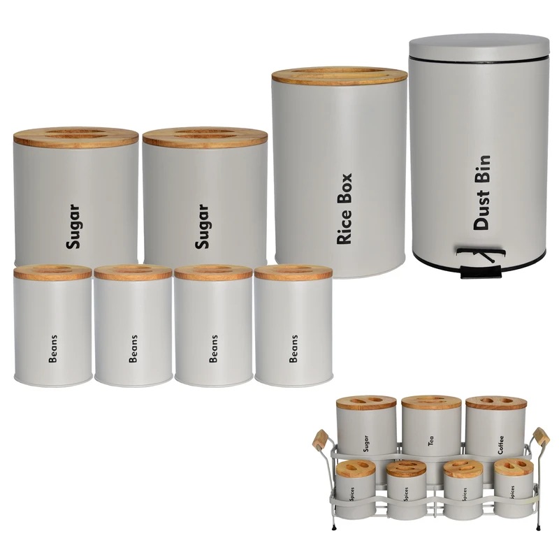 ۳ عدد پاسماوری، ۴ عدد جای ادویه، ۴ عدد ظرف حبوبات، ۱ عدد سطل زباله، ۱ عدد سطل برنج، ۱ عدد جای قند، ۱ عدد جای شکر.۱ عدد استند