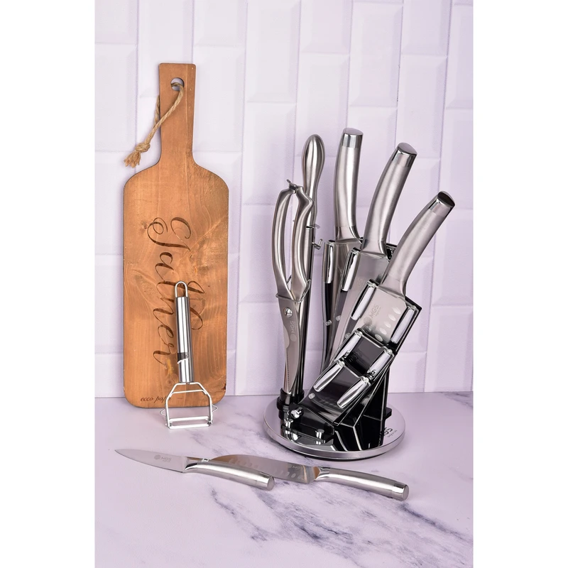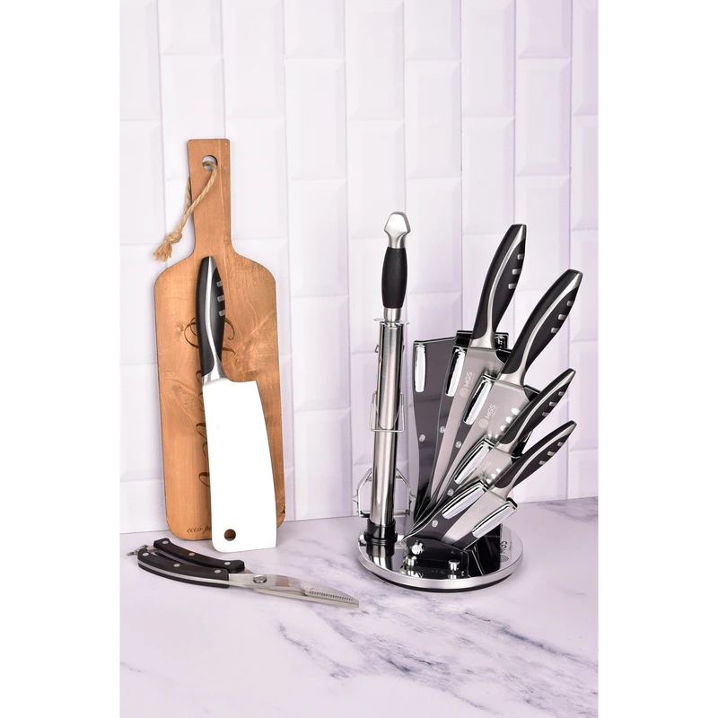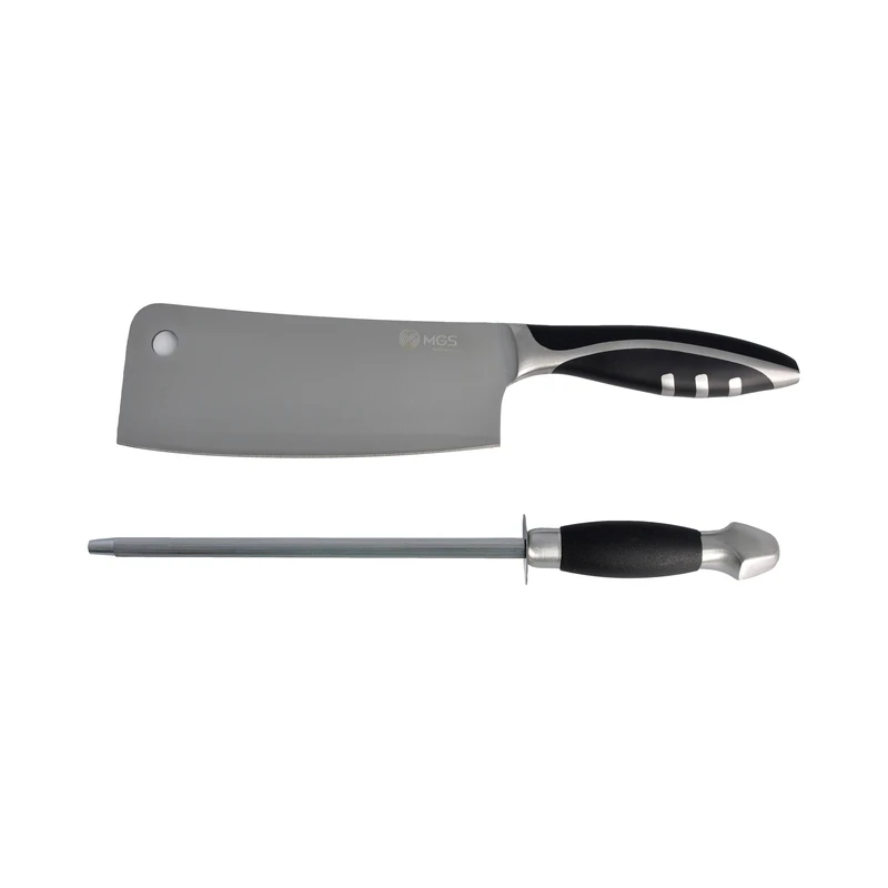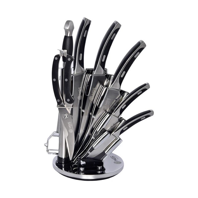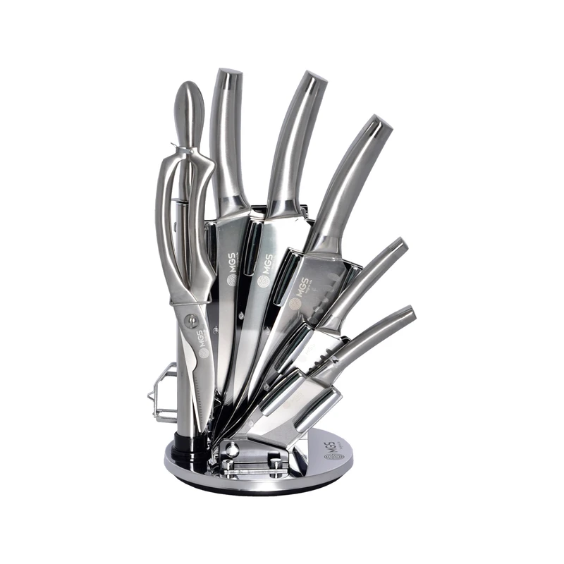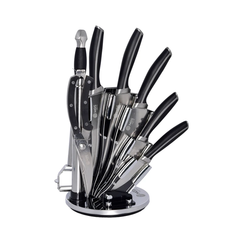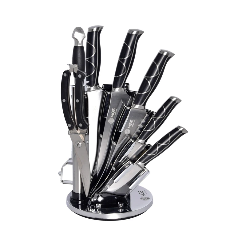 سرویس چاقوی 9 پارچه ام جی اس متشکل از 8 ابزار به همراه یک استند برای قرار دادن آنهاست، در این ست تیغه و دسته چاقو ها به صورت یک تکه ساخته شده اند تا امکان شکستن دسته وجود نداشته باشد.