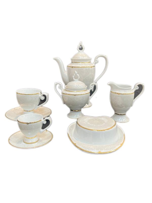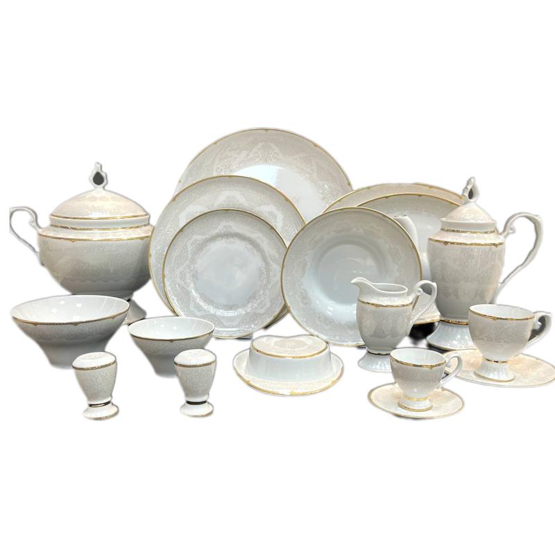 ۱۸عدد بشقاب غذاخورى/ ١٨عدد گود غذاخوری/ ۱۸عدد بشقاب پیش دستی/۱۸عدد کاسه ماست خوری/ ۳عدد دیس بیضی بزرگ/ ۱عدد دیس بیضی کوچک/ ۱عدد دیس گرد تهچین/ ۱عدد سوپ خوری دربدار/ ۱عدد قوری دربدار/ ۶عدد فنجان چای خوری و ۶عدد زیرفنجان/ ۶عدد فنجان قهوه خوری و ۶عدد زیر فنجان/ ۱عدد قندان دربدار/ ۸عدد نمکدان/۳عدد سس خوری یا شکر ریز/ ۱عدد کره خوری دربدار/ ۶عدد کاسه آبگوشت خوری/ /۲عدد کاسه سالاد بزرگ