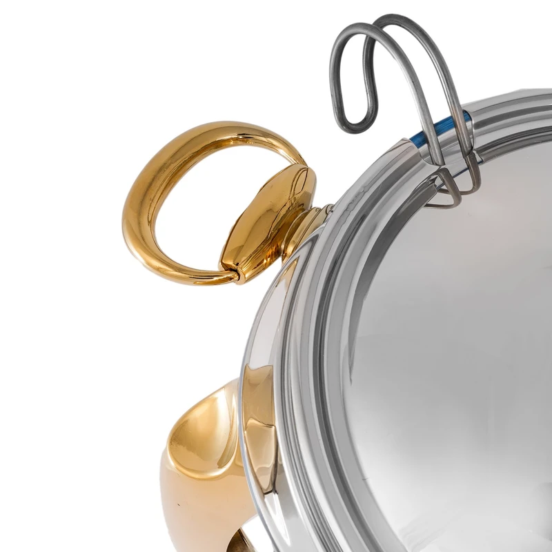 ساخته شده از استیل ضد زنگ دارای ظرف از جنس پیرکس دارای جای وارمر دارای یک عدد ملاقه