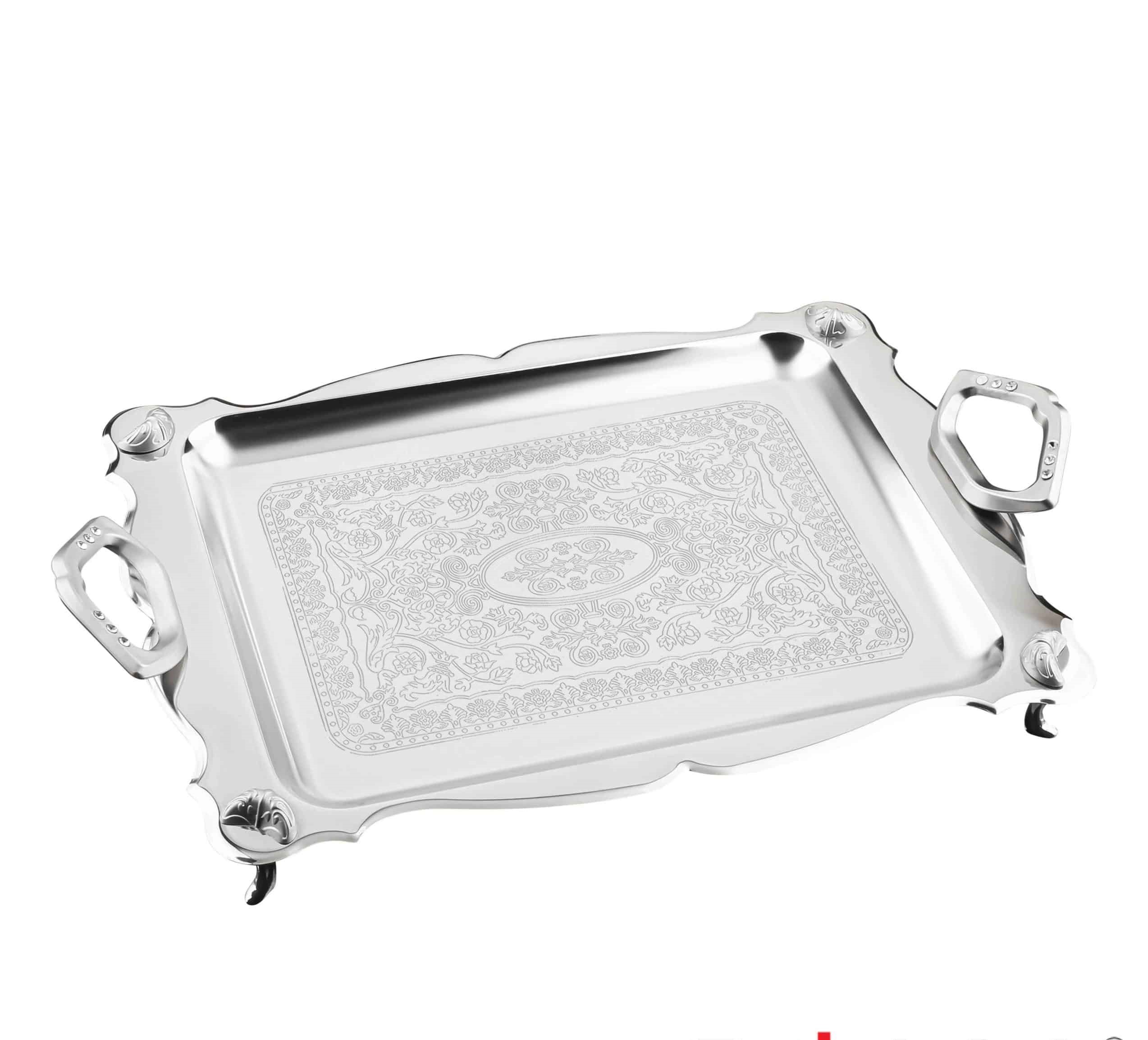 سینی استیل مستطیل بزرگ پایه دار طرح دار فریم سانا دسته حلقه نگین صدفی