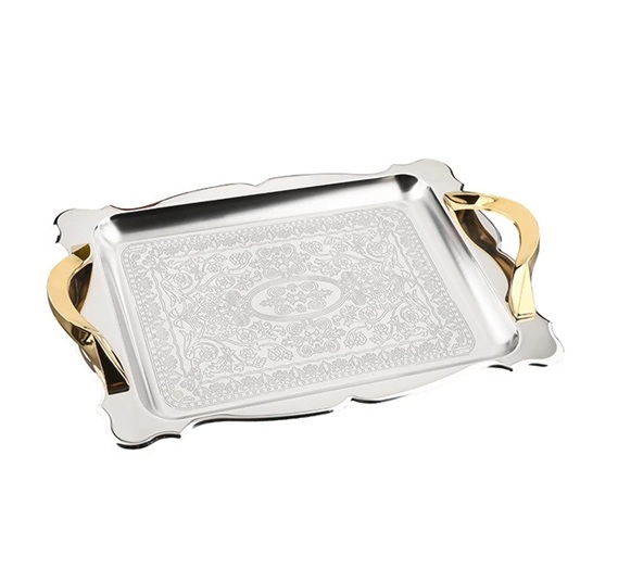 سینی استیل مستطیل کوچک طرح دار فریم سانا دسته دیاموند طلایی